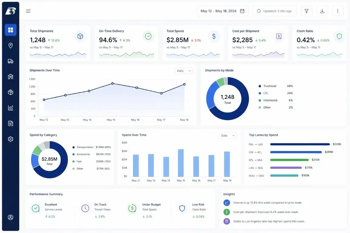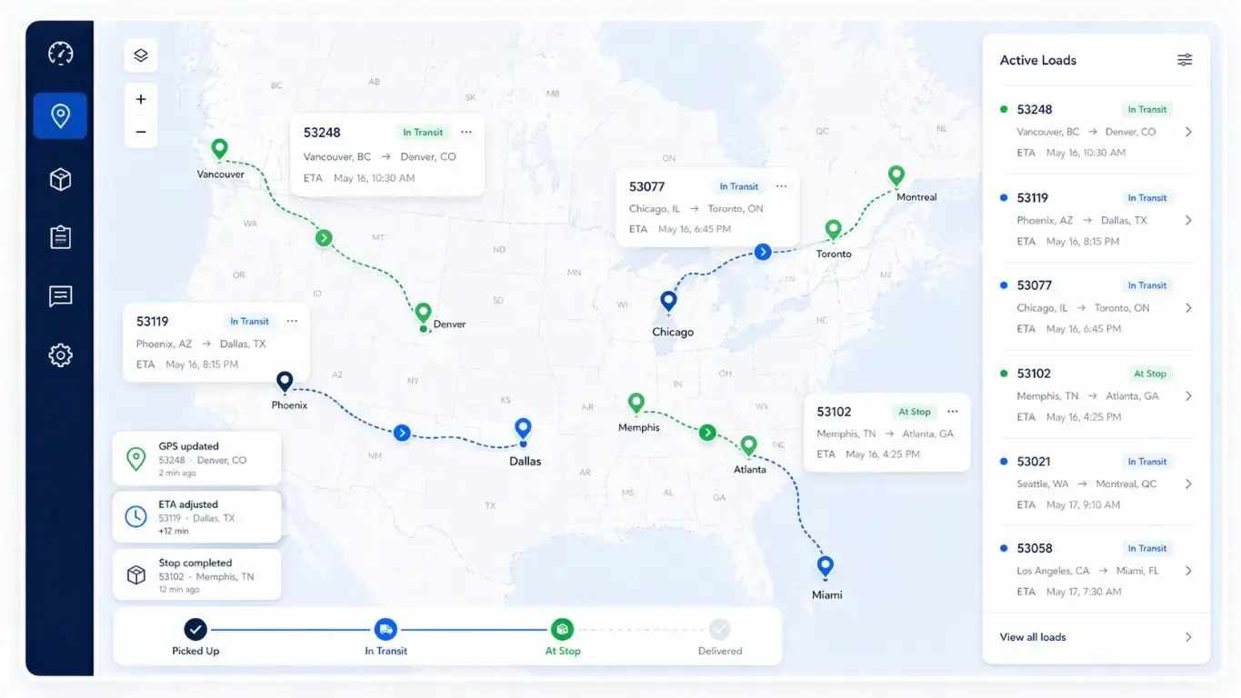 Monitor the real-time status of your brokerage shipments. Get location updates and estimated arrival times for all active loads.