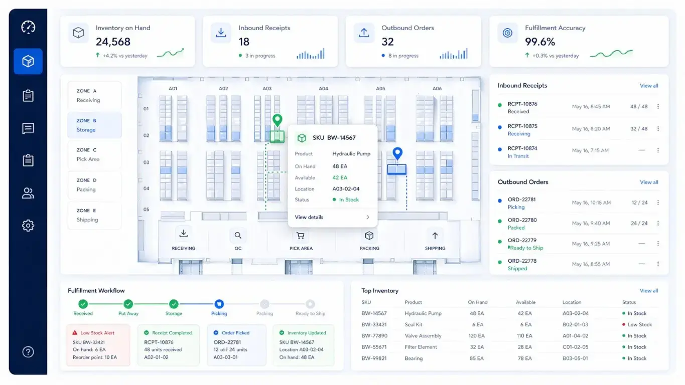 Log in to the Warehouse Management System to view inventory, track inbound receipts, and monitor outbound orders. Complete transparency for your distribution and fulfillment projects.